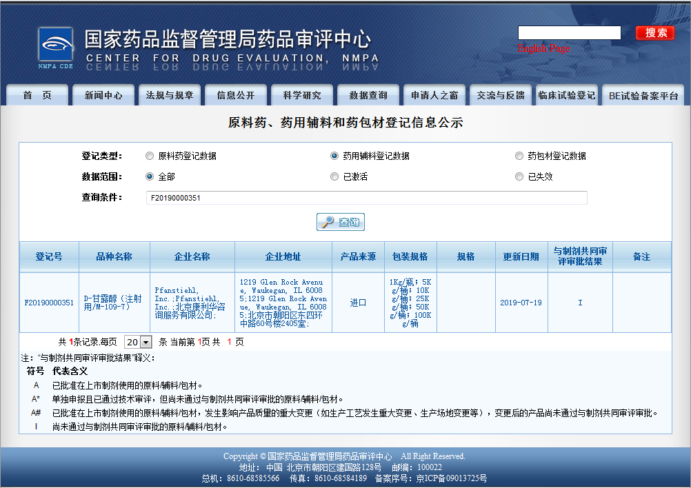 Pfanstiehl拳頭產(chǎn)品之一,D-甘露醇(M-109-7)CDE登記號(hào)F20190000351已在CDE網(wǎng)站公布: