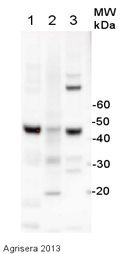 ? 免疫原:ca. 100 amino acids of recombinant actin conserved more than 80 % in Arabidopsis thaliana: actin-1 P0CJ46 AT2G37620, actin-2 Q96292 AT3G18780, actin-3 P0CJ47 AT3G53750, actin-4 P53494 AT5G59370, actin-5 Q8RYC2 At2g42100, actin-7 P53492 At5g09810, actin-8 Q96293 AT1G49240 , actin-11 P53496 , AT3G12110 ,actin-12 P53497 AT3G46520