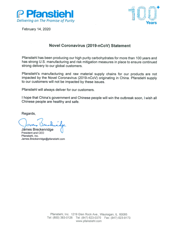 新型冠狀病毒肺炎 (COVID-19) 疫情已發(fā)展為影響全球的公共衛(wèi)生事件,隨著我國開啟全面的復工復產,我們的供應商Pfanstiehl承諾將一直保持產出并保障供應全球客戶。