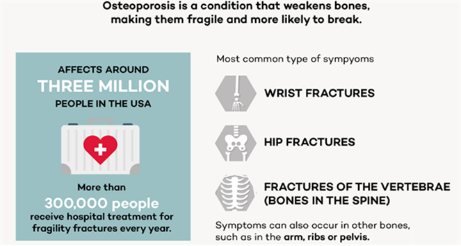 骨質(zhì)疏松癥是一種以骨密度降低為特征的肌肉骨骼系統(tǒng)疾病。肌肉骨骼系統(tǒng)是由骨骼、肌肉和相關(guān)元素,如軟骨、結(jié)締組織和關(guān)節(jié)所組成。它為身體提供形態(tài)、支撐和穩(wěn)定性,并使其運動。骨密度的降低會導(dǎo)致骨骼的收縮,從而會導(dǎo)致骨骼變得脆弱,增加骨折的風(fēng)險。