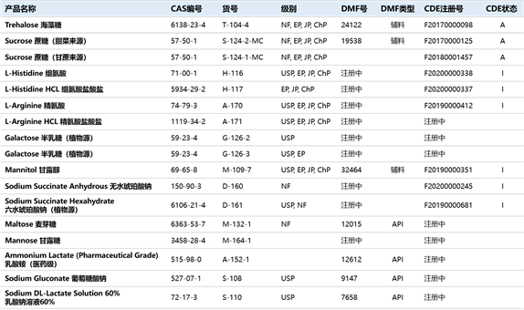 Pfanstiehl高純度低內毒素注射用糖類及氨基酸等十余種輔料產品。Pfanstiehl成立已有百余年歷史,專注于注射用輔料研發(fā)和生產,產品包括海藻糖、蔗糖、甘露醇、精氨酸、精氨酸鹽酸鹽、組氨酸、組氨酸鹽酸鹽等。Pfanstiehl所有產品支持CDE登記注冊,并且海藻糖和蔗糖已經(jīng)處于激活狀態(tài);