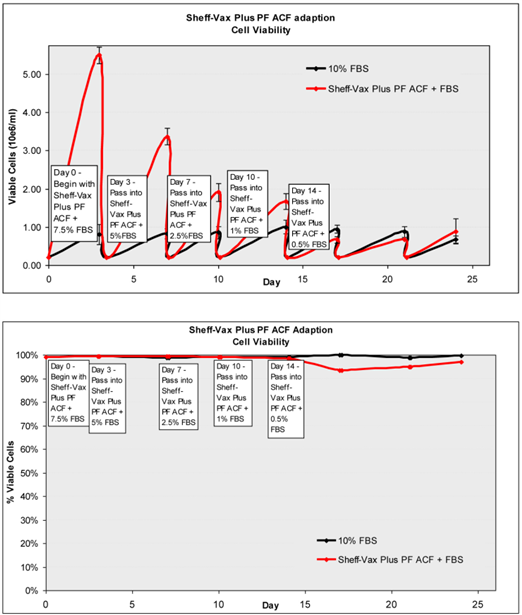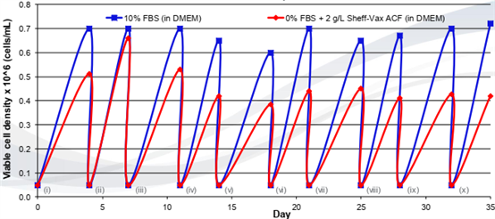 每次傳代逐步減少FBS,同時添加Sheff-Vax ACF,在相同培養(yǎng)時間內,無血清組細胞生長密度可達到10% FBS組細胞密度峰值的一半,延長培養(yǎng)時間還可以獲得更高的細胞密度(見下圖)。