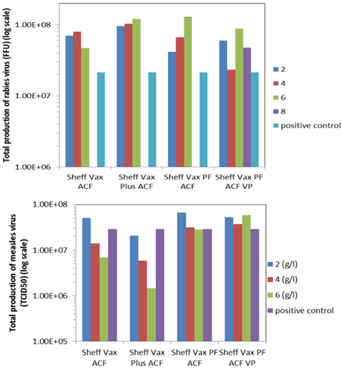 分別在培養(yǎng)狂犬病毒和麻疹病毒的細胞培養(yǎng)基中添加不同的Sheff-Vax產品,與對照組相比均能有效提升病毒生產滴度。在病毒增殖階段添加Sheff-Vax Plus PF ACF VP對病毒滴度也有顯著的提升(見下圖)。