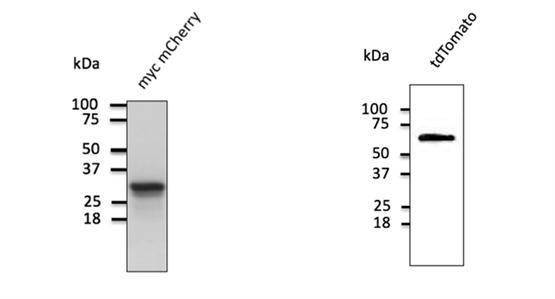 西美杰代理SICGEN品牌提供的Anti-mCherry和Anti-tdTomato均為從圓盤(pán)珊瑚中提取的紅色熒光蛋白的多克隆抗體。Anti-mCherry和Anti-tdTomato兩種抗體的抗原均是大腸桿菌表達(dá)的重組多肽純化而來(lái),用Western blot檢測(cè)轉(zhuǎn)染了兩種蛋白的HEK293細(xì)胞,分別可檢測(cè)到29kda和55kda的條帶。Anti-tdTomato抗體對(duì)tdTomato和mCherry均有特異性,但與綠色熒光蛋白(GFP)不發(fā)生交叉反應(yīng)。