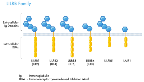 ? ? ? 白細胞免疫球蛋白樣受體 (The leukocyte immunoglobulin-like receptors, LILRs)?由抑制性LILR亞家族B(LILRB1-5)和激活性LILR亞家族A(LILRA1-6)組成。LILRB家族受體屬于I型跨膜糖蛋白,胞外區(qū)含有Ig樣結構域,胞內(nèi)區(qū)含有免疫受體酪氨酸抑制基序(ITIM)結構域,是免疫抑制性受體。LILRBs(LILRB1-5)主要在髓系細胞表達,同時在腫瘤干細胞上也高表達,并可能直接調(diào)控癌癥的發(fā)生和復發(fā)以及腫瘤干細胞的活性。LILRBs能抑制腫瘤免疫活性,并支持癌細胞在多種癌癥中存活,促進腫瘤生長和轉移。