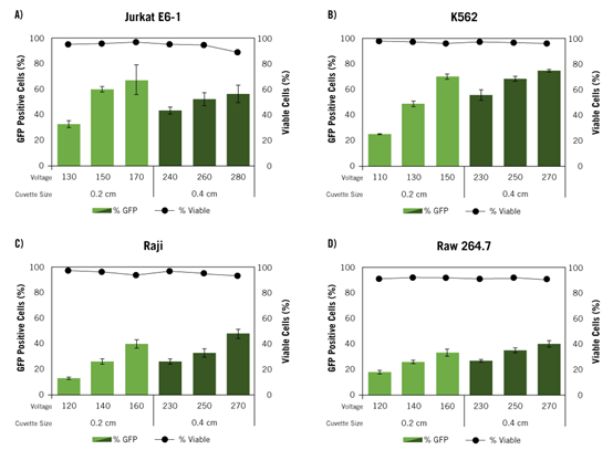 Jurkat E6-1 (A)、K562 (B)、Raji (C)和Raw 264.7 (D)細(xì)胞在不同電壓條件下使用Ingenio®電轉(zhuǎn)緩沖液和Ingenio®EZporator®電轉(zhuǎn)儀,分別用0.2cm和0.4cm電轉(zhuǎn)杯和EGFP報(bào)告基因觀察電轉(zhuǎn)效率。電穿孔后48h,用流式細(xì)胞術(shù)測定GFP陽性細(xì)胞百分比(柱狀圖)和細(xì)胞活率(點(diǎn)線圖)。