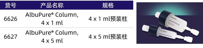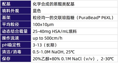 AlbuPure®是Astrea Bioseparations和Albumedix公司合作開發(fā)的白蛋白親和層析填料,填料基架是粒徑均一的高交聯(lián)瓊脂糖,配基是合成的三嗪化合物,具體高流速、高動(dòng)態(tài)結(jié)合載量、強(qiáng)化學(xué)耐受性等特點(diǎn),主要用于白蛋白融合蛋白的純化。AlbuPure®的性能參數(shù)如下表所示。