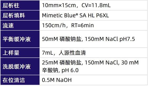 在一項(xiàng)測(cè)試中,研究人員將未經(jīng)處理的人源性血清直接上樣到裝有Mimetic Blue® SA HL P6XL填料的層析柱中,層析工藝參數(shù)如下表所示: