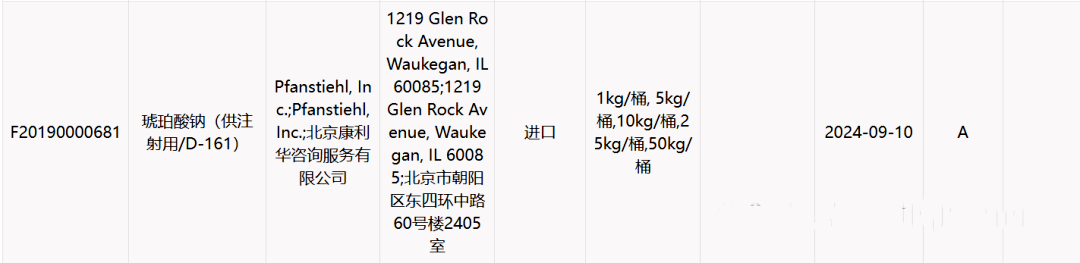 “ 熱烈祝賀Pfanstiehl品牌六水合琥珀酸鈉(供注射用/D-161)CDE注冊登記號F20190000681已激活!”