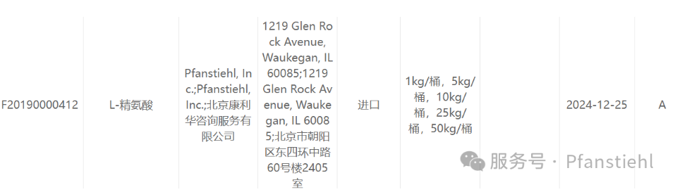 “ 熱烈祝賀Pfanstiehl品牌注射級精氨酸A-170 CDE注冊登記號F20190000412已激活!”Pfanstiehl新年喜訊頻傳,注射級精氨酸A-170 CDE登記號F20190000412激活了。Pfanstiehl品牌注射級精氨酸A-170,秉承一貫高品質理念,具有超高純度,超低內毒素,超低金屬殘留的特點,單獨檢測29種金屬離子,并且新增DNA,RNA,DNA酶,RNA酶和脂肪酶,亞硝酸鹽等多項質量指標的檢測,符合多國藥典規(guī)定(USP, EP, JPE, ChP),可用于生物治療性藥物和疫苗的生產(chǎn)。· 產(chǎn)品名稱: L-Arginine, High Purity, Low Endotoxin,