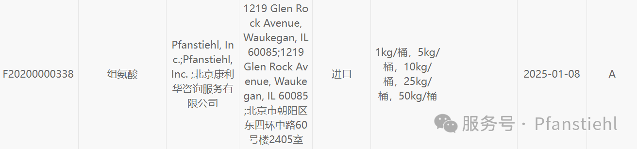 “ 熱烈祝賀Pfanstiehl品牌注射級組氨酸H-116 CDE注冊登記號F20200000338已激活!”