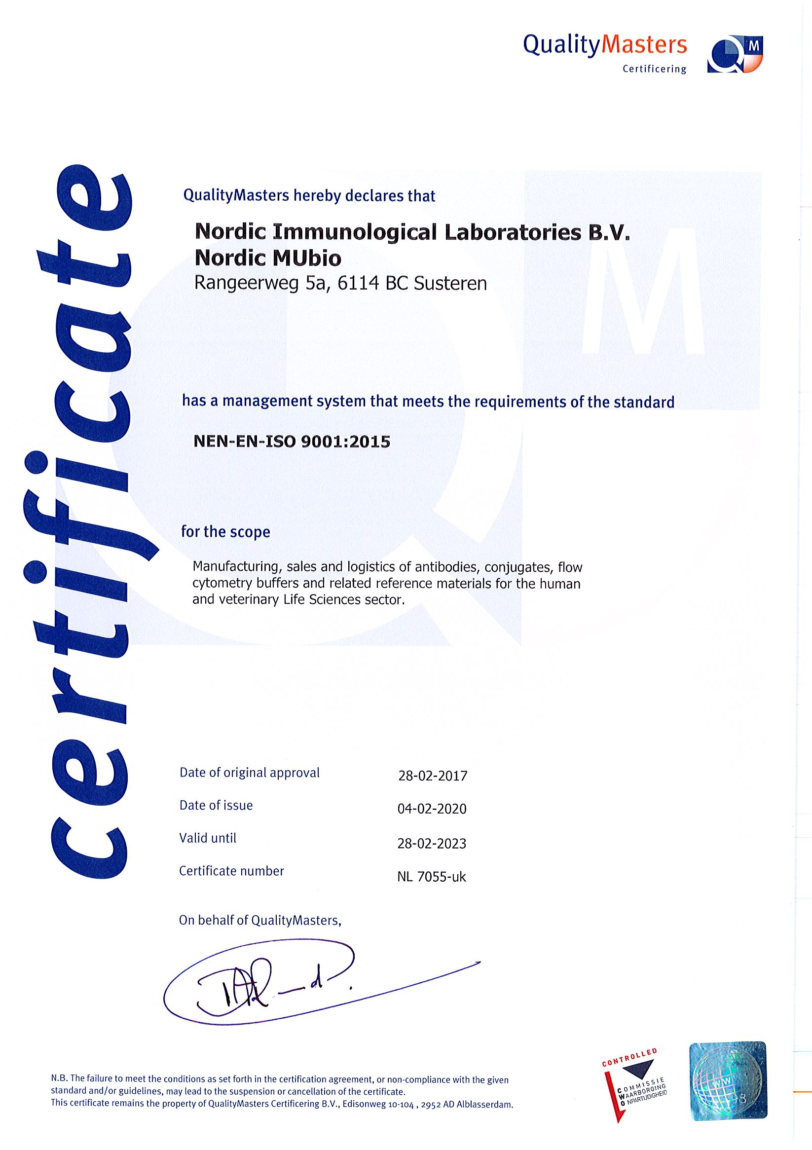 Nordic-MUbio公司供應(yīng)2000多種用于生物醫(yī)學(xué)和獸醫(yī)研究的基礎(chǔ)免疫學(xué)試劑,包括抗血清、抗體、免疫復(fù)合物、純化蛋白、對照品、血清蛋白標(biāo)準(zhǔn)品和其他校準(zhǔn)品。他們包括高度特異性的單克隆抗體,以及用于不同試驗(yàn)體系的標(biāo)記二抗。Nordic-MUbio嚴(yán)格遵守IS09001標(biāo)準(zhǔn)生產(chǎn)高質(zhì)量的抗體,80%以上的抗體經(jīng)過冷凍組織免疫組化檢測,近70%的產(chǎn)品通過流式細(xì)胞術(shù)驗(yàn)證,50%的產(chǎn)品通過WB驗(yàn)證。同時(shí)Nordic-MUbio也是斑馬魚抗體開發(fā)的引領(lǐng)者,擁有50多種可用于斑馬魚熒光檢測的抗體。Nordic-MUbio的核心優(yōu)勢在于每一個(gè)單項(xiàng)產(chǎn)品都提供及時(shí)的技術(shù)支持并擁有廣泛的科學(xué)數(shù)據(jù)、圖片和文獻(xiàn)參考資料。